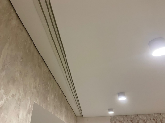 Позволяет сэкономить высоту, так как устанавливается вровень с натяжным потолком